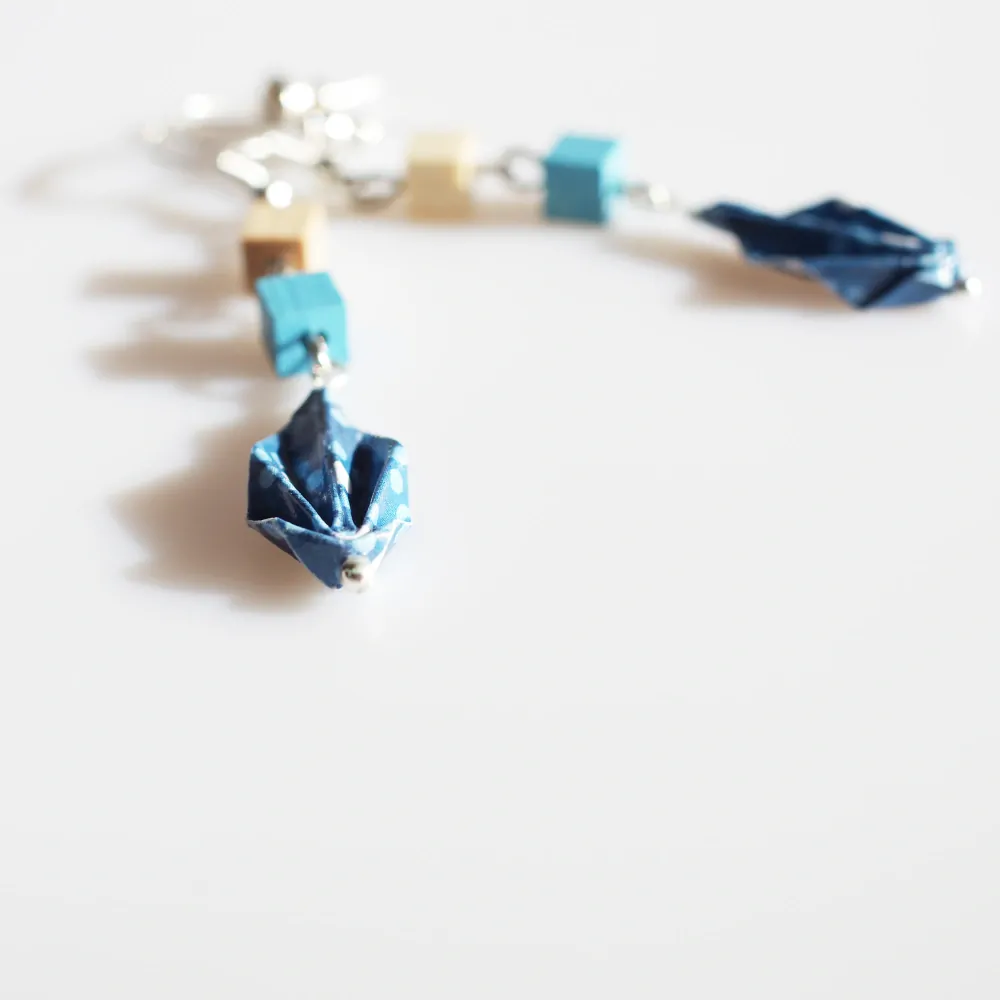 Origami náušnice vytvořené z kvalitního origami papíru zakoupeného u Jerja. Jsou doplěny dřevěnými korálky v ladících barvách a zavěšeny na bižuterní háček.