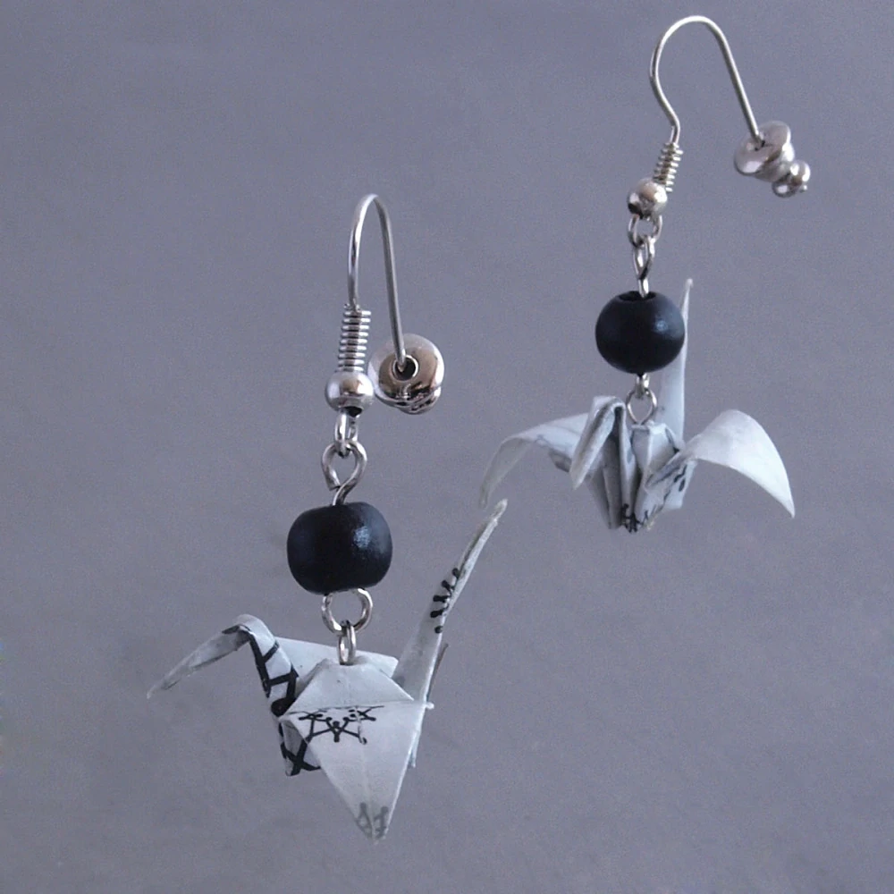 Náušnice vytvořené z origami papíru od www.maiki.cz. Složila jsem z něj tvar tradičního jeřába a doplnila korálkem. Použila jsem běžné bižuterní komponenty, všechny by měly být bez obsahu niklu. V případě potřeby je možné (na Vaši žádost) háček vyměnit za chirurgickou ocel. Samozřejmostí jsou kovové zarážky, abyste náušnice neztratily. Celková délka náušnice (bez háčku) je 2 cm. Náušnice je opatřena několika vrstvami laku, takže procházka deštěm ji nijak neohrozí. Pouze koupání, sprchování a spánek s nimi nedoporučuji. Nedávno všechny mé náušnice přestály průtrž mračen s vichřicí na jednom trhu, a to bez jakékoliv úhony! Náušnice obdržíte v malé dárkové krabičce mé vlastní výroby.