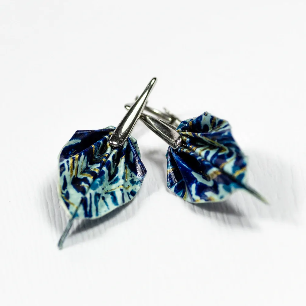 Origami náušnice vytvořené z kvalitního japonského washi papíru. Jsou upevněny na háček z chirurgické oceli vyrobený na zakázku.