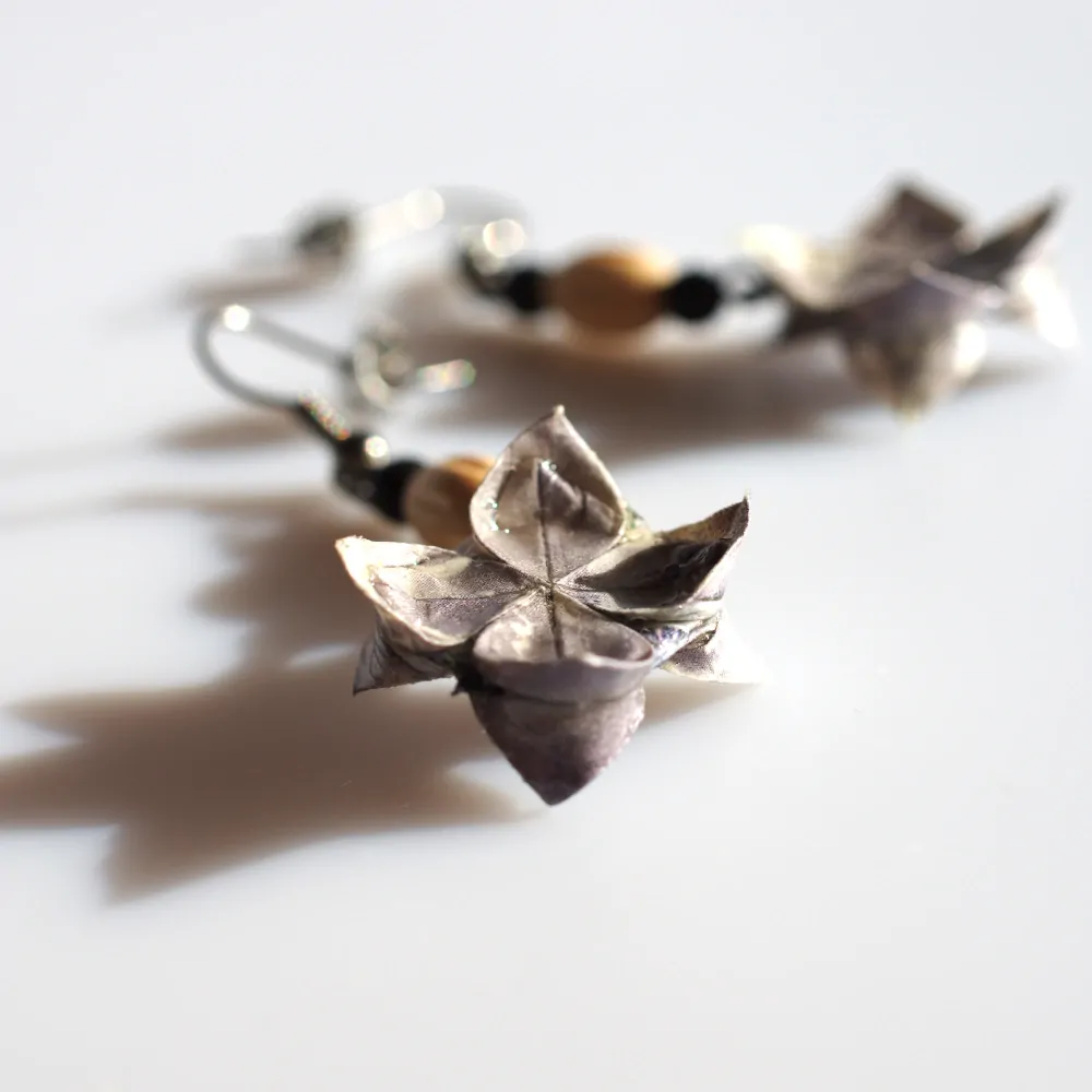 Jde o náušnice tvořené origami květy. Květiny jsou složeny z čajových sáčků Pickwick Earl Grey. Květy jsou doplněny barevně ladícími dřevěnými korálky. Použila jsem háček z chirurgické oceli, takže by nemělo dojít k žádným alergickým reakcím. Také kovová zarážka proti ztrátě je z tohoto materiálu.