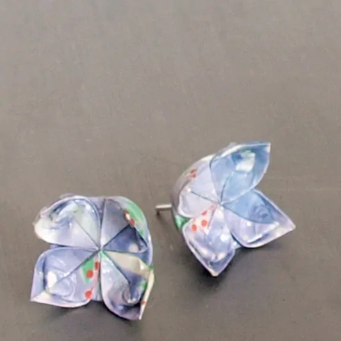Jde o náušnice vytvořené origami technikou do tvaru lotosového květu na platinové puzetě. Puzeta je z běžného bižuterního kovu, který by neměl obsahovat žádné alergenní kovy. Květiny jsou složeny z japonského yuzen papíru v barvě fialové s drobnými kvítky. Lotos má rozměr cca 1,2 x 1,2 cm. Po složení jsou náušnice několikrát nalakovány, což zajistí pevnost a odolnost proti dešti. Rozhodně však nedoporučuji koupání. Puzetu je v případě zájmu možno vyměnit za jiný druh. Je však poté potřeba počítat se zdržením dodání zboží - musím vyrobit nové náušnice. Náušnice jsou dodávány v dárkové krabičce mé vlastní výroby.