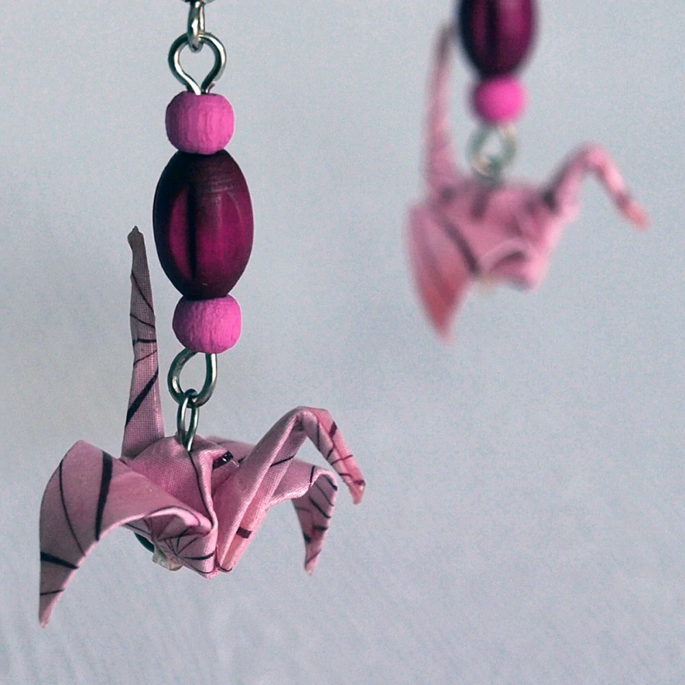 Náušnice vytvořené z origami papíru od www.maiki.cz. Složila jsem z něj tvar tradičního jeřába a doplnila dřevěnými korálky.