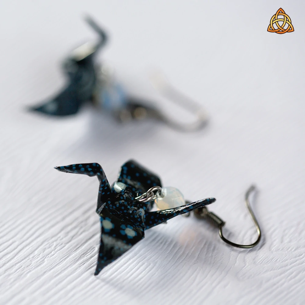 Náušnice vytvořené z washi papíru dovezeného z Japonska. Papír je v tmavě modré s drobným vzorem světle modré a bílé. Složila jsem z něj tvar tradičního jeřába a doplnila fazetovanou kuličkou opalitu.