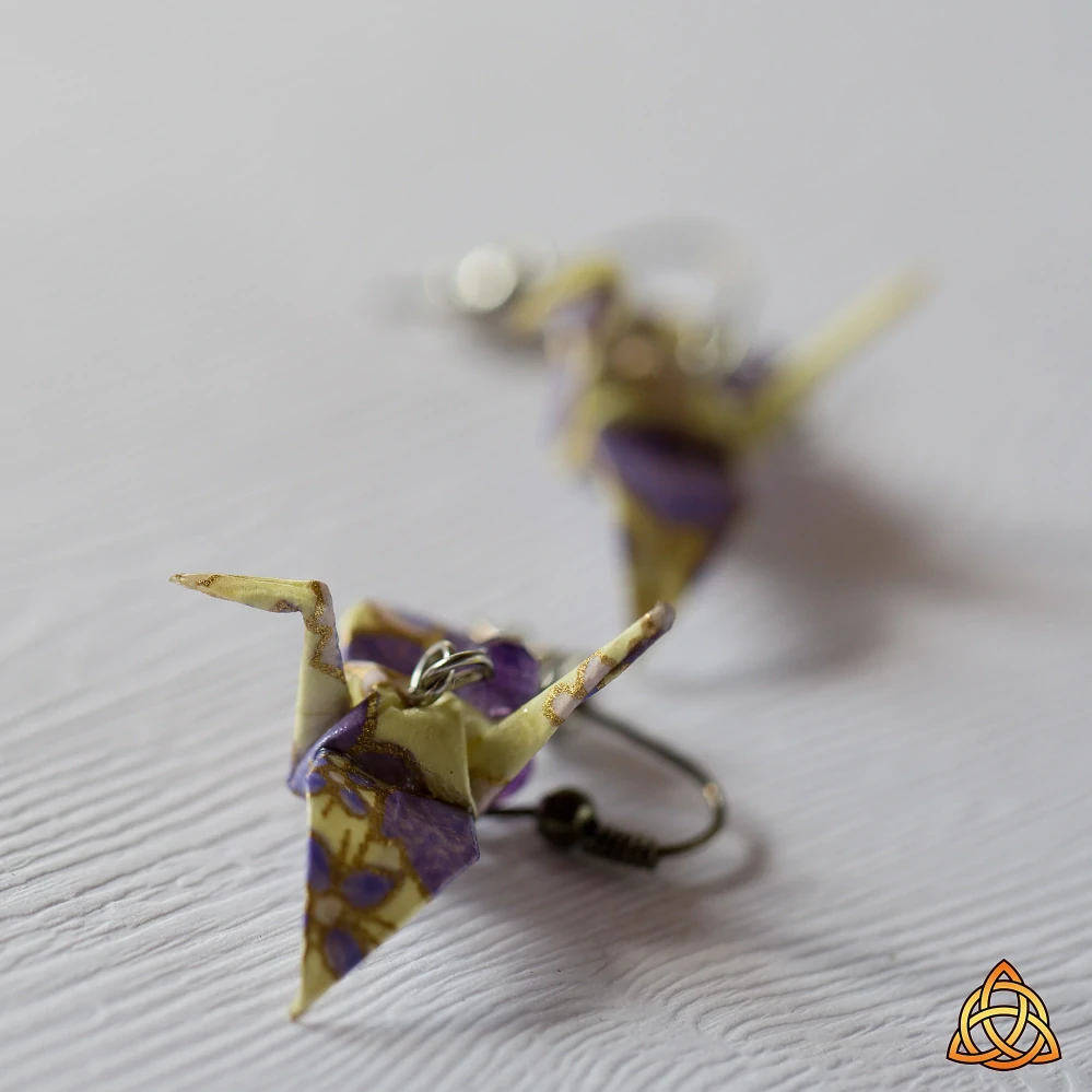 Náušnice vytvořené z washi papíru dovezeného z Japonska. Papír je jemný, s tiskem fialových květů na krémovém podkladu (číslo 14 z mé nabídky origami papírů). Složila jsem z něj tradičního jeřába pro štěstí a doplnila broušenými fasetovanými kuličkami z ametystu.
