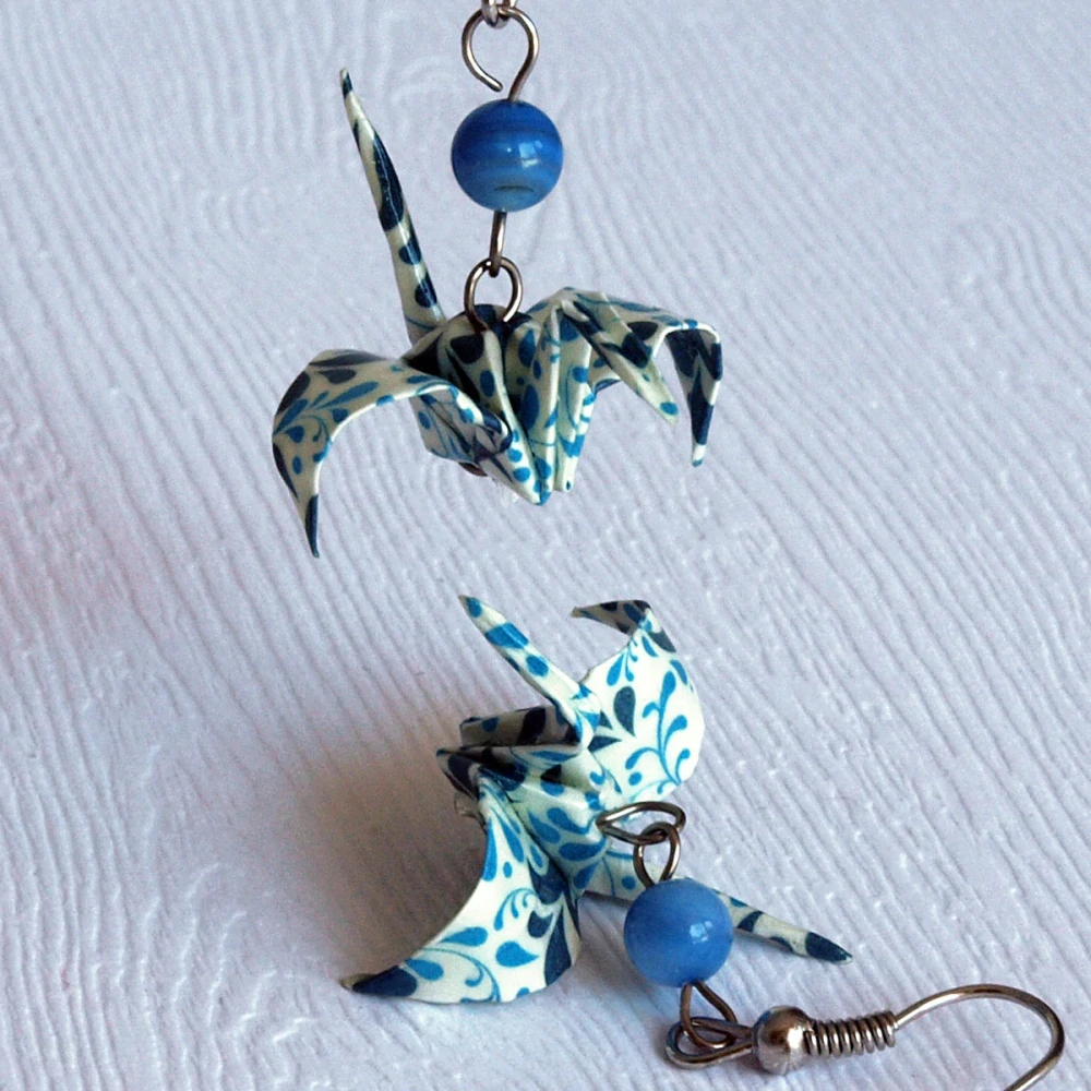 Náušnice vytvořené z origami papíru od www.maiki.cz. Složila jsem z něj tvar tradičního jeřába a doplnila dřevěnými korálky v odpovídajících barvách.