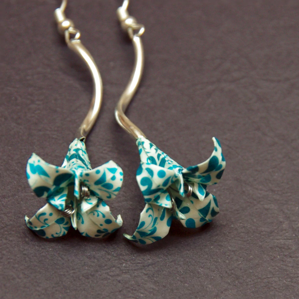 Náušnice vytvořené z origami papíru od http://www.fler.cz/jerja. Složila jsem z něj tvar lilie.