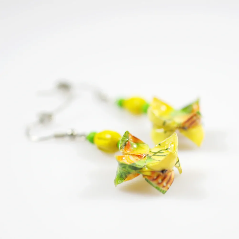 Jde o náušnice tvořené origami květy. Květiny jsou složeny z čajových sáčků Teekanne. Květy jsou doplněny barevně ladícími dřevěnými korálky. Použila jsem háček z chirurgické oceli, takže by nemělo dojít k žádným alergickým reakcím. Také kovová zarážka proti ztrátě je z tohoto materiálu.