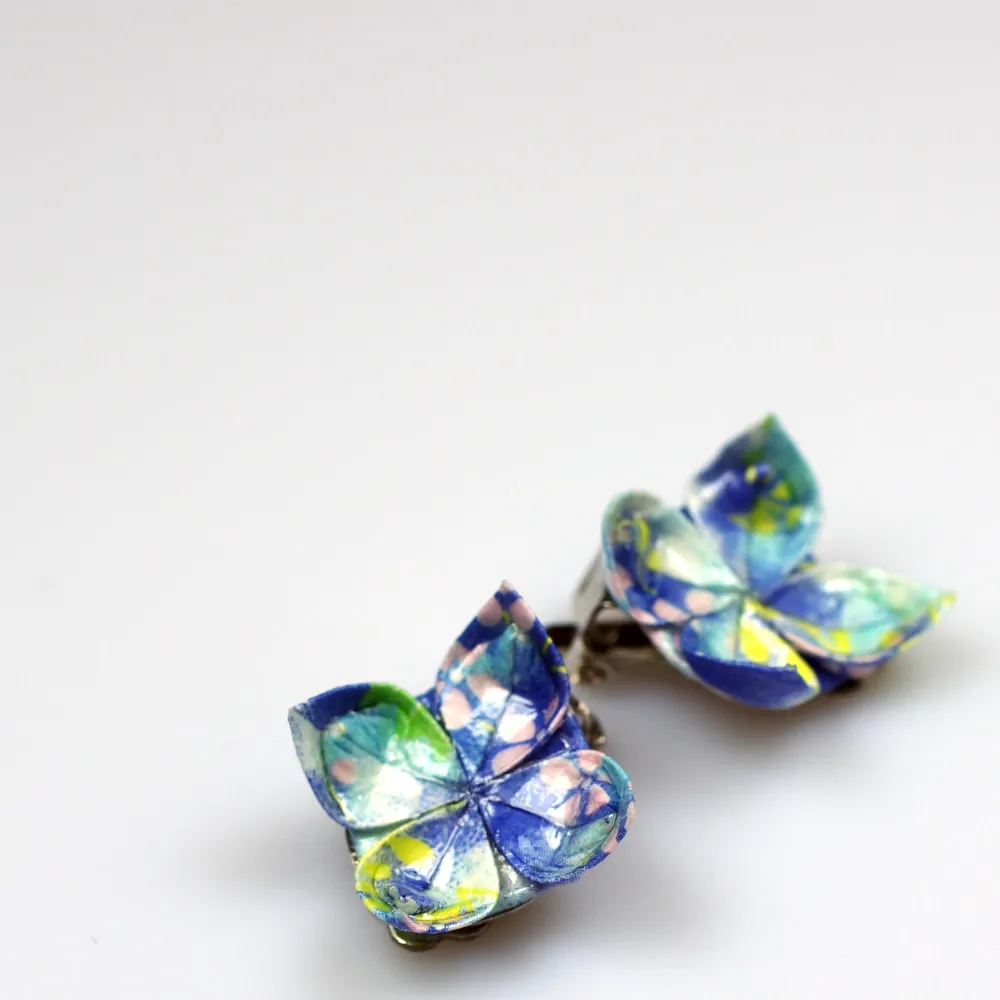 Jde o náušnice tvořené origami květem na platinové klipse. Květiny jsou složeny ze japonského yuzen origami papíru v barvě modré se vzorem drobných růžových kvítků a zelených lístků.