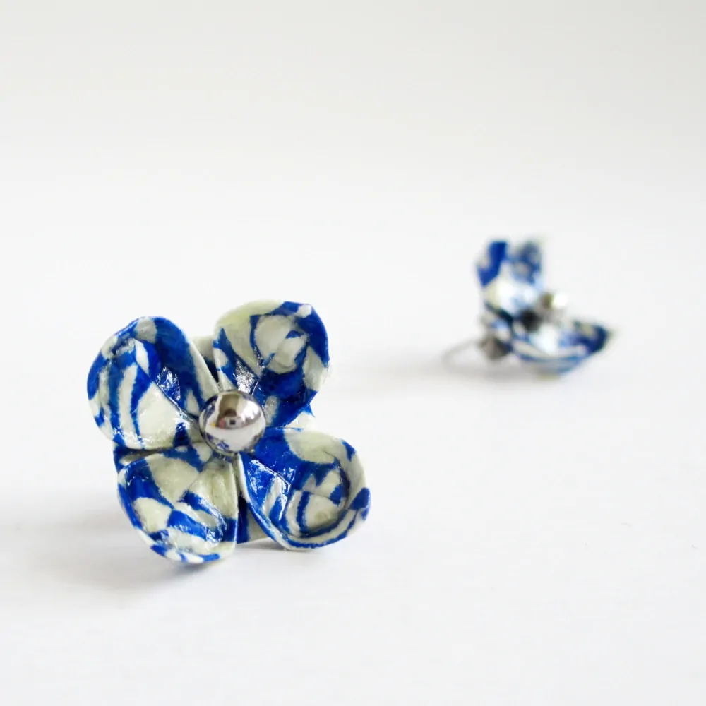 Jde o náušnice vytvořené origami technikou do tvaru lotosového květu na puzetě z chirurgické oceli. Květiny jsou složeny z japonského washi papíru v bílé barvě s modrým vzorem.
