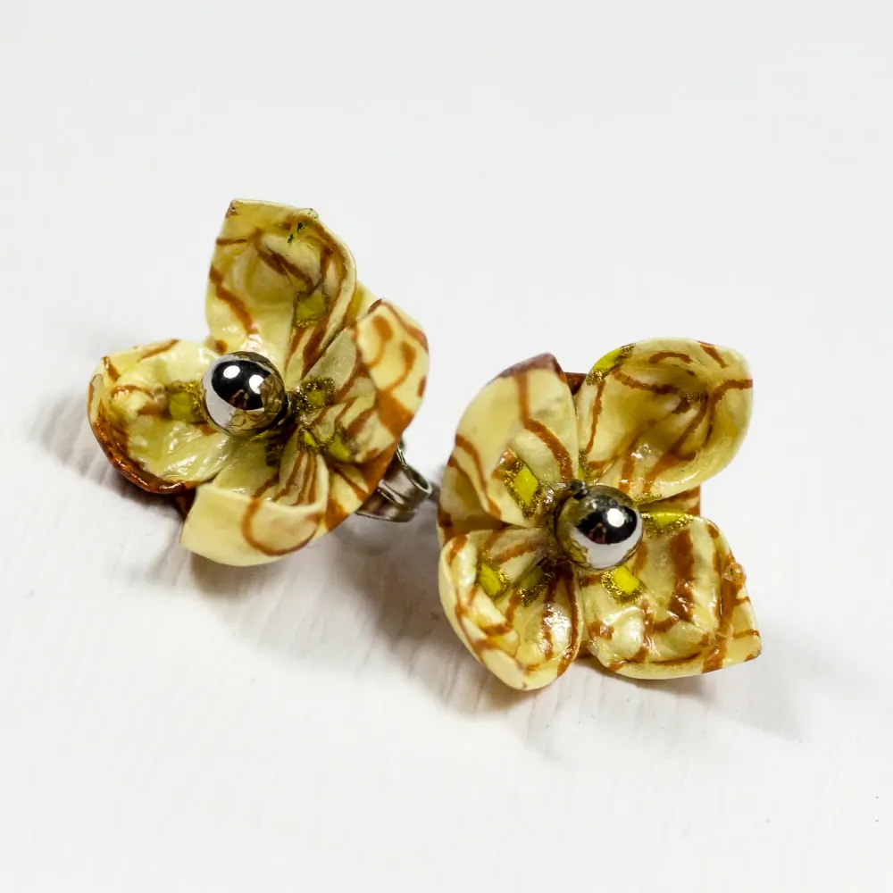 Jde o náušnice vytvořené origami technikou do tvaru lotosového květu na puzetě z chirurgické oceli. Květiny jsou složeny z japonského washi papíru se vzorem jemných zlatavě hnědých linek a čar.