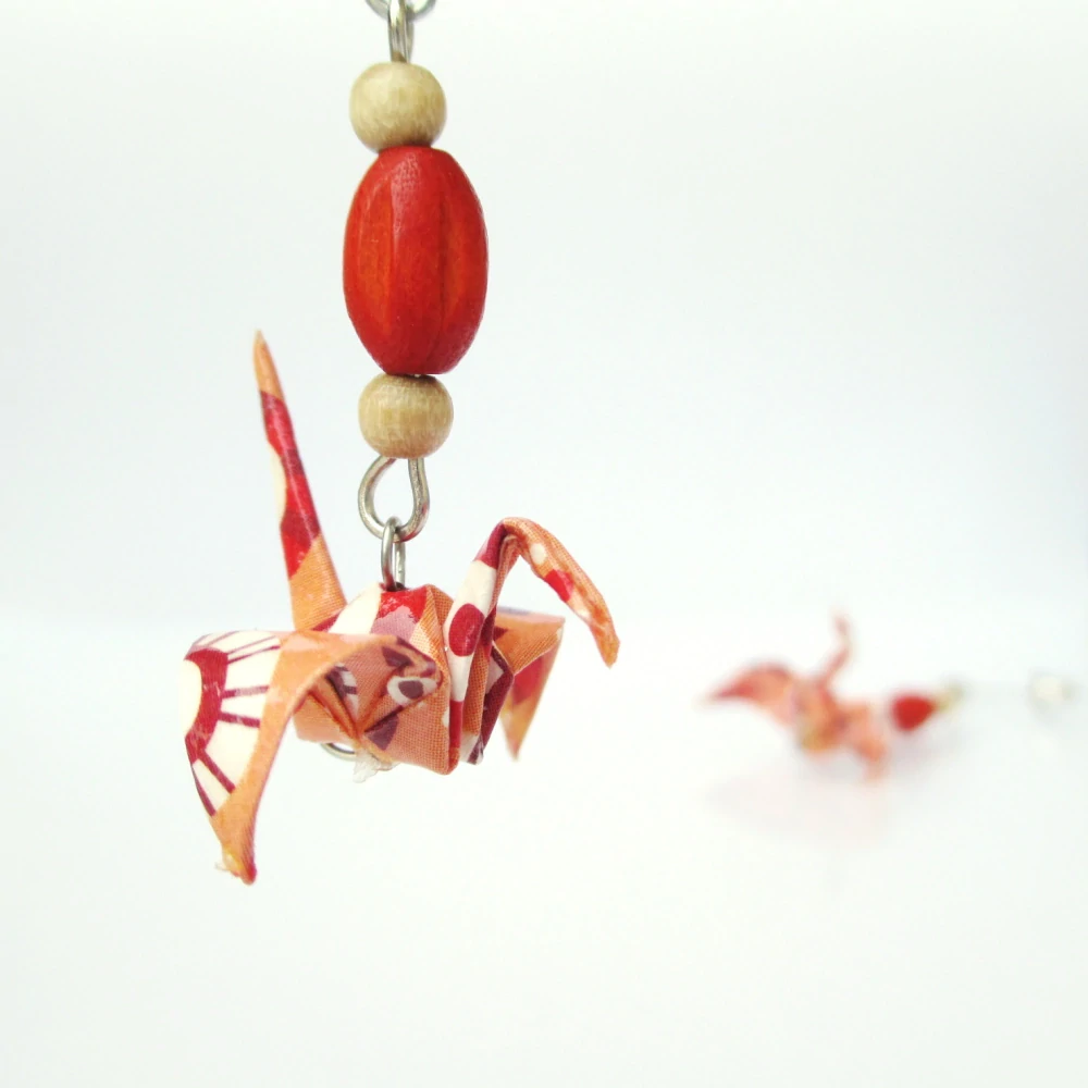 Náušnice vytvořené z origami papíru. Složila jsem z něj tvar tradičního jeřába a doplnila dřevěnými korálky.