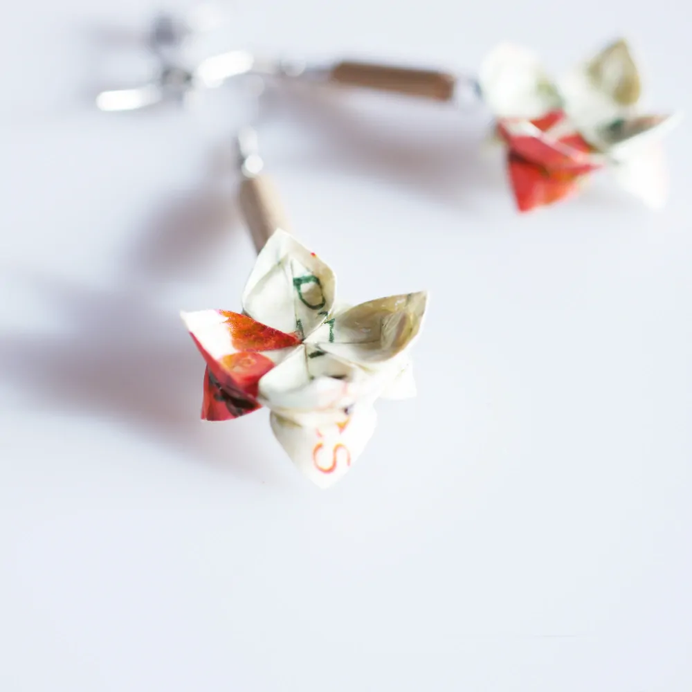 Jde o náušnice tvořené origami květy. Květiny jsou složeny z čajových sáčků Teekanne Red Berries (bílý čaj s příchutí červeného ovoce). Květy jsou doplněny barevně ladícími dřevěnými korálky. Použila jsem háček z chirurgické oceli, takže by nemělo dojít k žádným alergickým reakcím. Také kovová zarážka proti ztrátě je z tohoto materiálu.