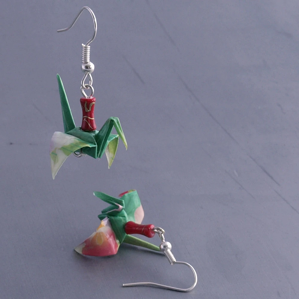 Náušnice vytvořené z origami papíru od www.maiki.cz. Složila jsem z něj tvar tradičního jeřába a doplnila porcelánovým korálkem. Použila jsem běžné bižuterní komponenty, všechny by měly být bez obsahu niklu. V případě potřeby je možné (na Vaši žádost) háček vyměnit za chirurgickou ocel. Samozřejmostí jsou kovové zarážky, abyste náušnice neztratily. Celková délka náušnice (bez háčku) je 2 cm.