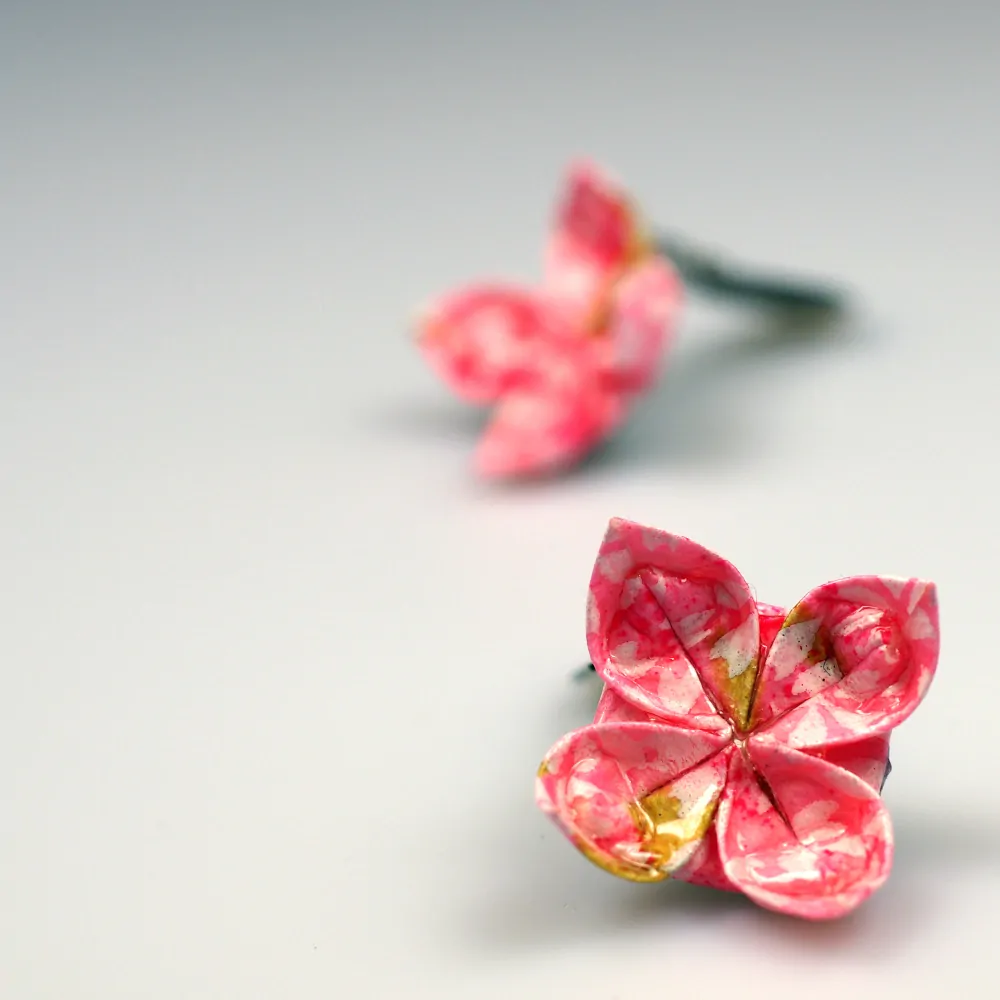 Jde o náušnice tvořené origami květem na platinové klipse. Květiny jsou složeny ze japonského washi origami papíru v barvě růžové s jemným květinovým vzorem.