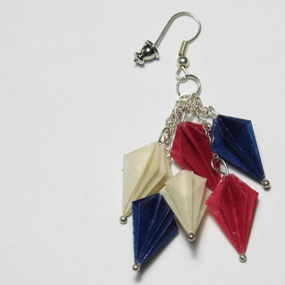 Jedná se o náušnice vzniklé z korálků vytvořených metodou origami z tenkého origami papíru v našich národních barvách. Každý korálek je zavěšen na řetízku barvy stříbrné a všechny dohromady visí na háčku téže barvy. Háček je bez obsahu niklu a neměl by tedy vadit běžným alergikům. Celková délka náušnice (včetně háčku) je 6,5 cm. Náušnice jsou samozřejmě opatřeny zarážkou proti ztrátě.