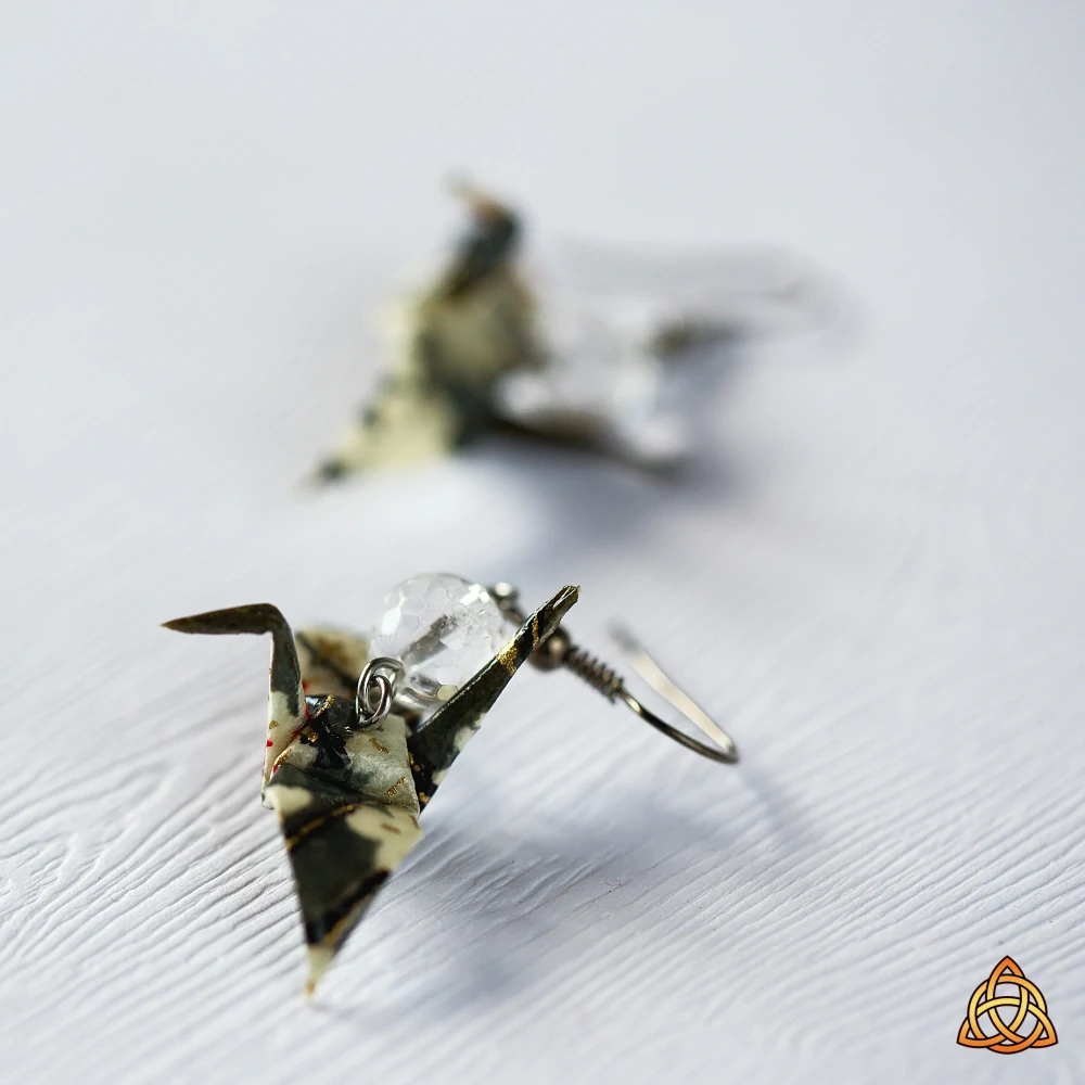 Náušnice vytvořené z washi papíru dovezeného z Japonska. Papír je šedý se vzorem sakurových květů v barvách růžové a bílé. Složila jsem z něj tvar tradičního jeřába a doplnila fazetovanými kuličkami z křišťálu s turmalínem.