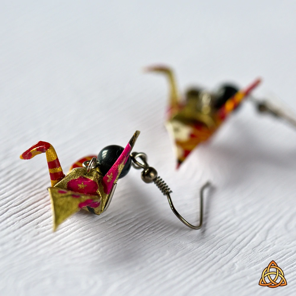 Náušnice vytvořené z washi papíru dovezeného z Japonska. Papír je jemný, s tiskem sakurových květů na zlatém podkladu (číslo 36 z mé nabídky origami papírů). Složila jsem z něj tradičního jeřába pro štěstí a doplnila broušenou kuličkou z gagátu.