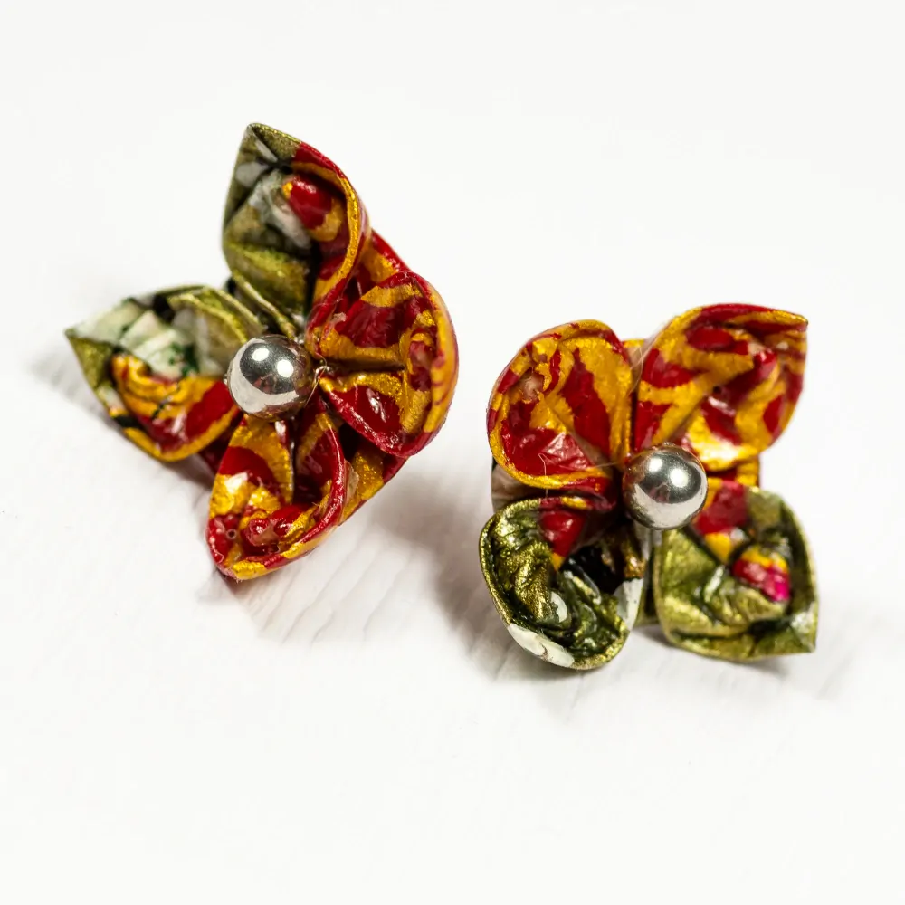 Jde o náušnice vytvořené origami technikou do tvaru lotosového květu na puzetě z chirurgické oceli. Květiny jsou složeny z japonského washi papíru s výrazným purporovým a zlatým dekorem.