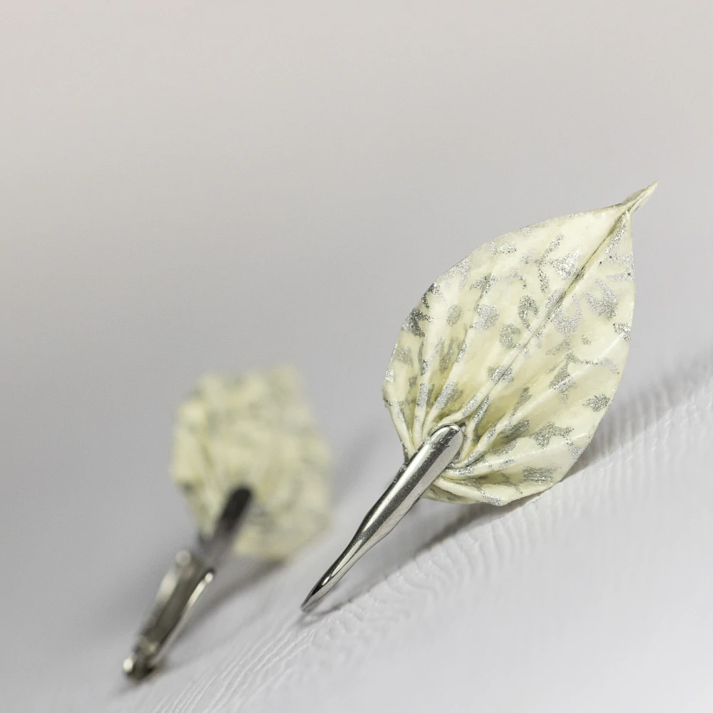 Origami náušnice vytvořené z kvalitního japonského washi papíru. Jsou upevněny na háček z chirurgické oceli vyrobený na zakázku.