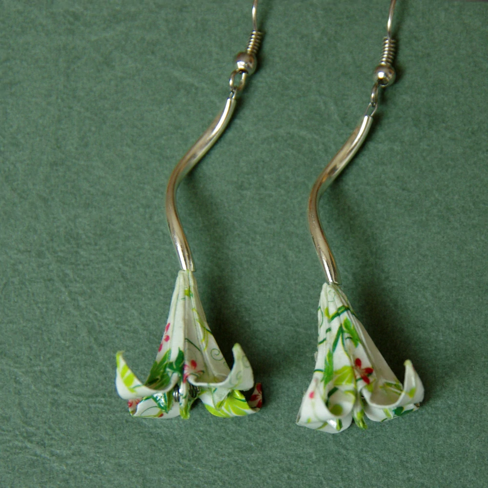 Náušnice vytvořené z origami papíru od http://www.fler.cz/jerja. Složila jsem z něj tvar lilie.