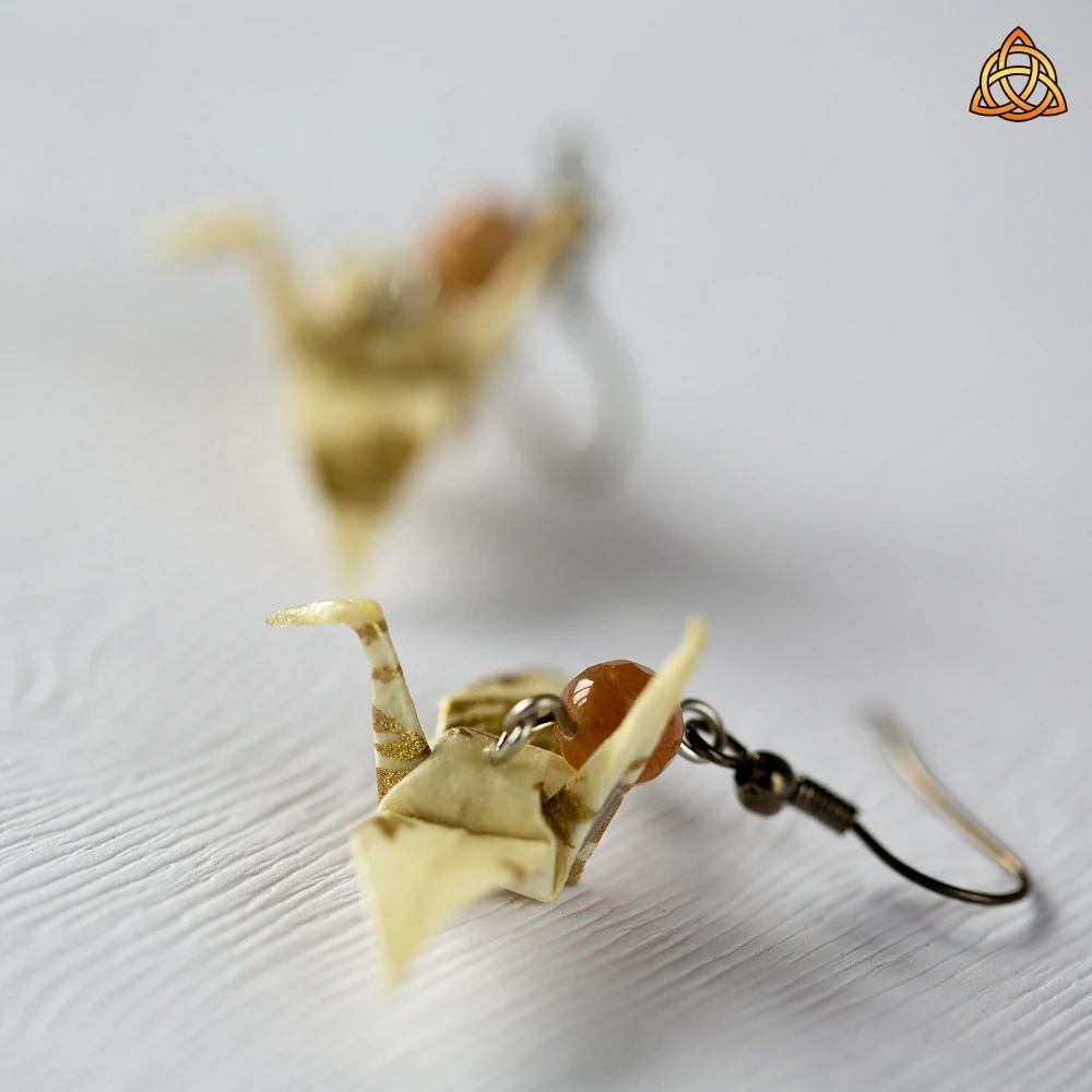 Náušnice vytvořené z washi papíru dovezeného z Japonska. Papír je bílý se zlatým vzorem letících jeřábů. Složila jsem z něj tvar tradičního jeřába a doplnila fazetovou kuličkou měsíčního kamene.