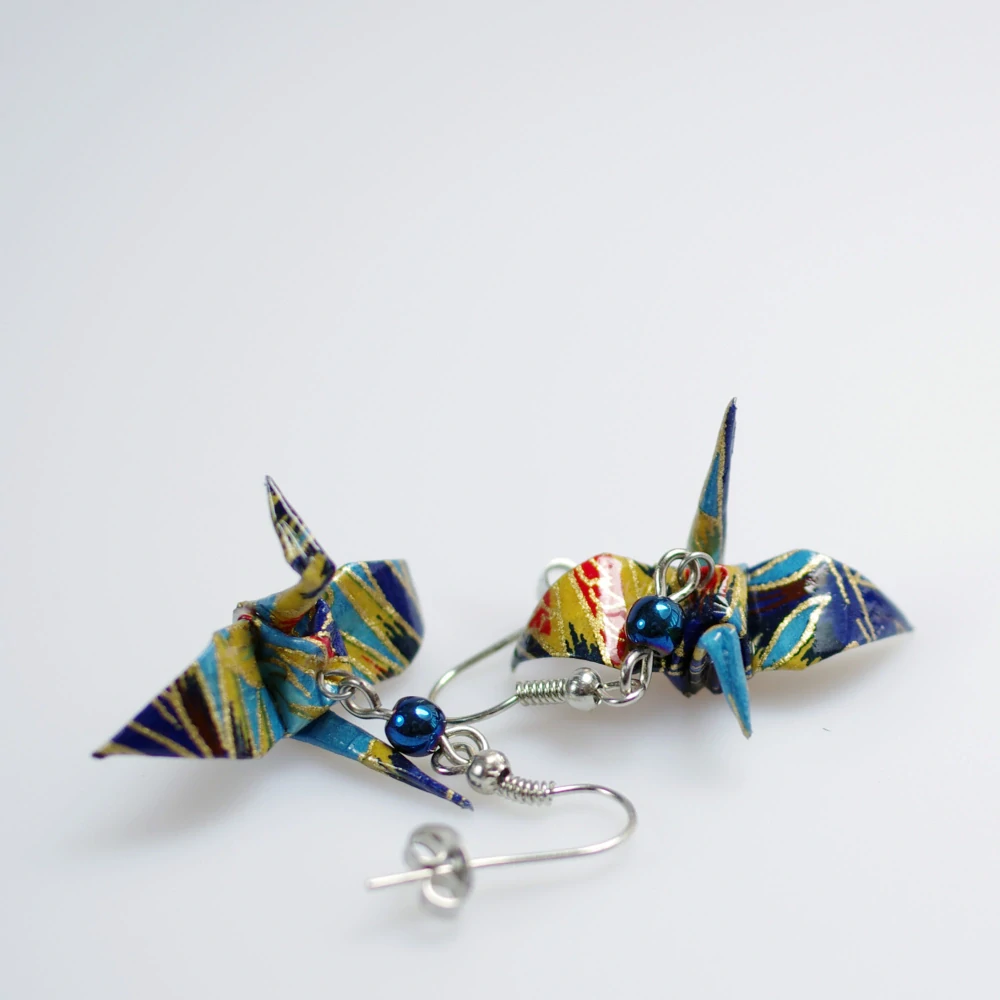 Náušnice vytvořené z washi papíru dovezeného z Japonska. Papír je tmavě modrý s potiskem v různých jasných barvách. Složila jsem z něj tvar tradičního jeřába a doplnila korálkem modrého hematitu.