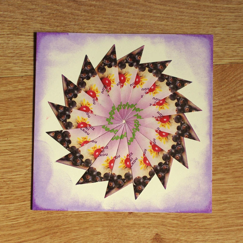 Papírové čtvercové přání velikosti 135x135 mm . Je tvořeno skládaným neběleným kartonem, který je doplněn 3D ozdobou vzniklou metodou tea bag folding (tj. z čajových sáčků). Celkový vzhled přání je dotvořen razítkovací barvou.
