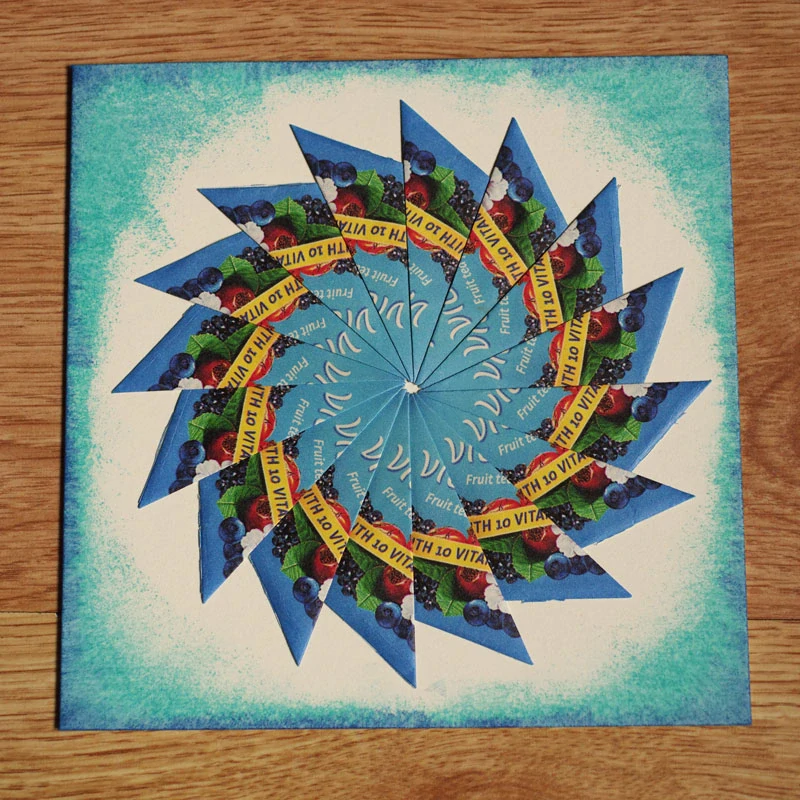 Papírové čtvercové přání velikosti 135x135 mm . Je tvořeno skládaným neběleným kartonem, který je doplněn 3D ozdobou vzniklou metodou tea bag folding (tj. z čajových sáčků). Celkový vzhled přání je dotvořen razítkovací barvou.