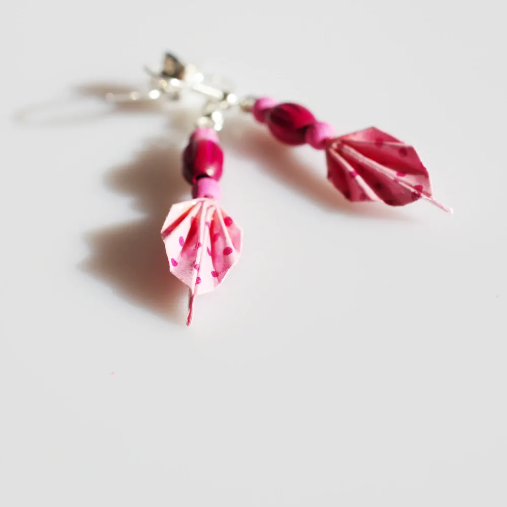 Origami náušnice vytvořené z kvalitního origami papíru zakoupeného u Jerja. Jsou doplěny dřevěnými korálky v ladících barvách a zavěšeny na bižuterní háček.