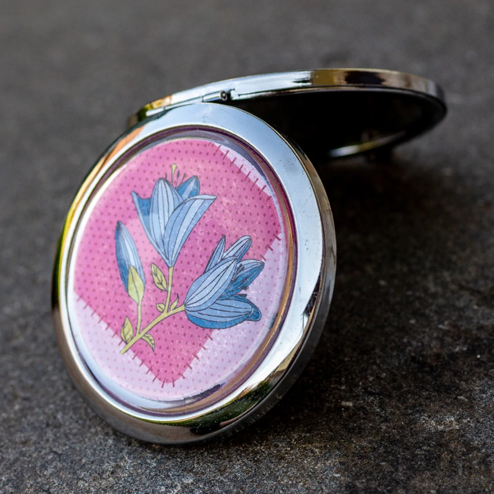 Jedná se o kapesní zrcátko platinové barvy. Velikost zrcátka 7 cm, velikost motivu je 5 cm. Obsahuje dvě zrcátka - běžné a zvětšovací (kosmetické). Na vrchní straně je ozdobeno scrapbookovým papírem s motivem v barvách tmavě růžové se světle růžovou . Zrcátko je dodáváno v dárkovém organzovém sáčku.