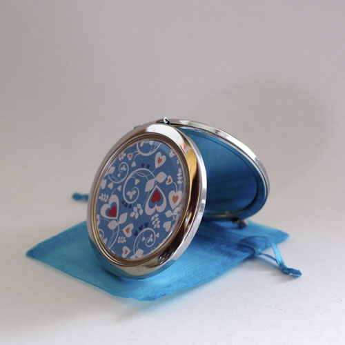 Jedná se o kapesní zrcátko platinové barvy. Velikost zrcátka 7 cm, velikost motivu je 5 cm. Obsahuje dvě zrcátka - běžné a zvětšovací (kosmetické). Na vrchní straně je ozdobeno scrapbookovým papírem s motivem v barvách modré . Zrcátko je dodáváno v dárkovém organzovém sáčku.