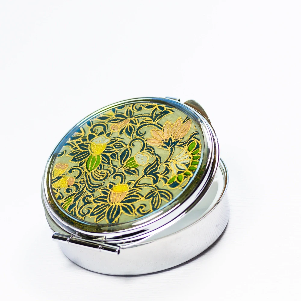 Krabička na léky - lékovka má kulatý tvar a je z bižuterního kovu. Uvnitř krabičky jsou tři přihrádky na léky a ještě je doplněna zrdcátkem. Každá lékovka je ozdobena rozlišným desingovým papírem ( např.japonským origami papírem ) zalitým křišťálovou pryskyřicí. Je z čeho vybírat.