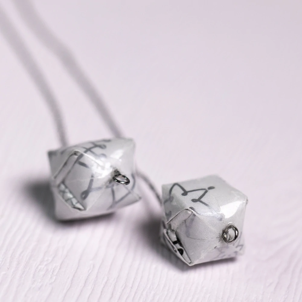 Náušnice jsou vytvořeny z origami papíru s potiskem vloček v černé, stříbrné a šedé barvě. Složila jsem z něj vodní bombu a tu vyplnila dutým vláknem a navlékla na řetízek z chirurgické oceli. Řetízek se přímo provléká uchem a volně pak visí dolů. Náušnice dodávám s umělohmotnou zarážkou, abyste je nemohly ztratit.