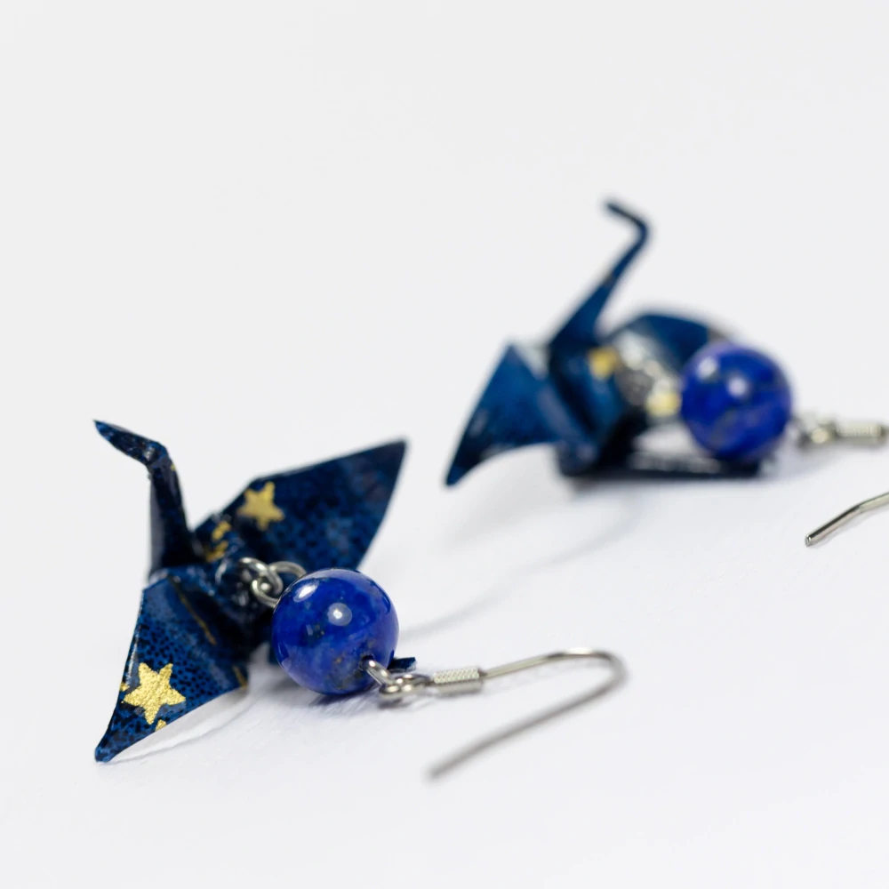 Náušnice vytvořené z washi papíru dovezeného z Japonska. Papír je tmavě mmodrý s potiskem zlatých kvězd a souhvězdí. Složila jsem z něj tvar tradičního jeřába a doplnila kuličkou lapisu lazuli.