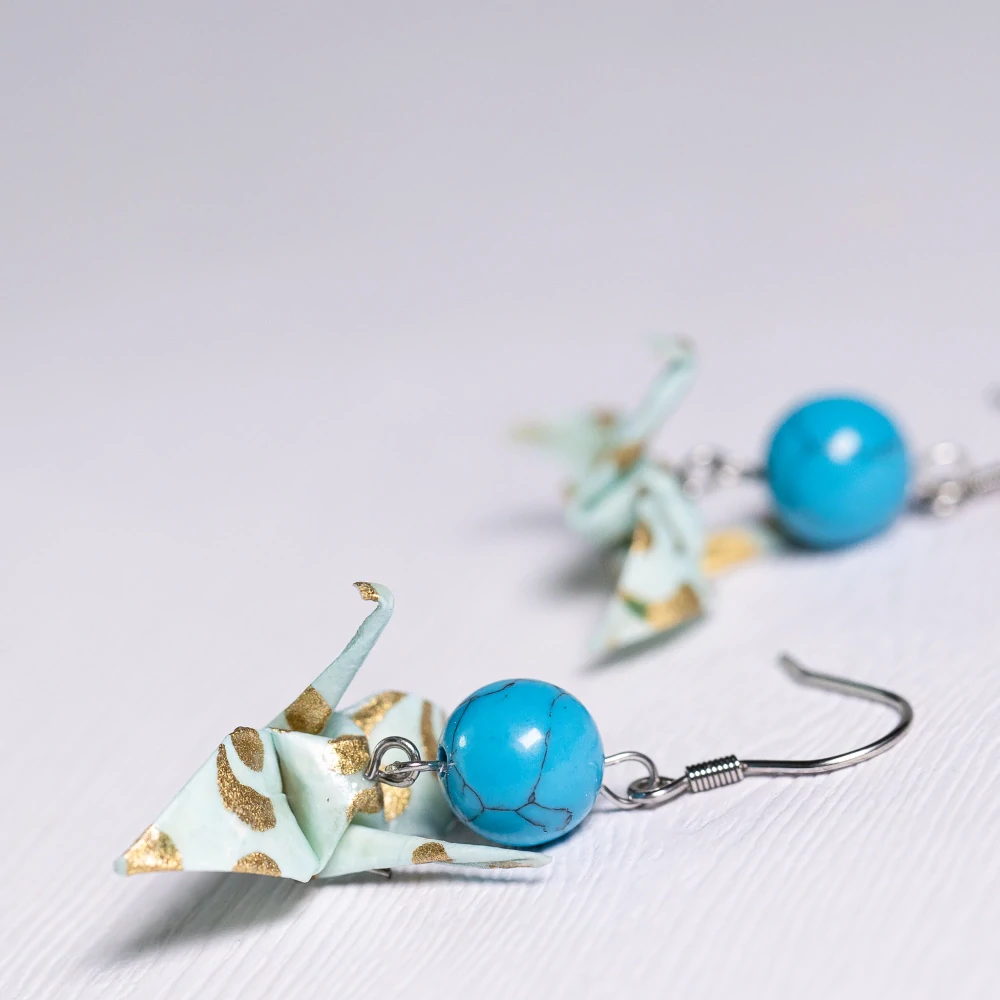 Náušnice vytvořené z washi papíru dovezeného z Japonska. Papír je světle modrý se zlatým vzorem. Složila jsem z něj tvar tradičního jeřába a doplnila kuličkami z tyrkenitu.