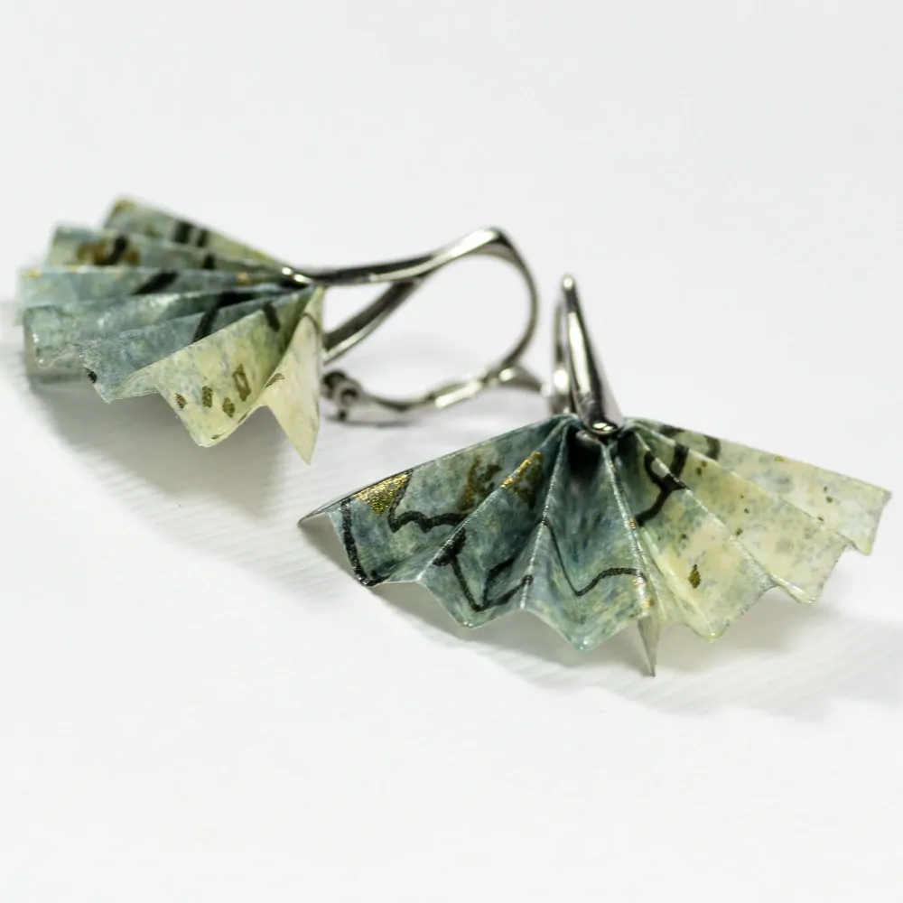 Origami náušnice vytvořené z kvalitního japonského washi papíru. Jsou upevněny na háček z chirurgické oceli vyrobený na zakázku.