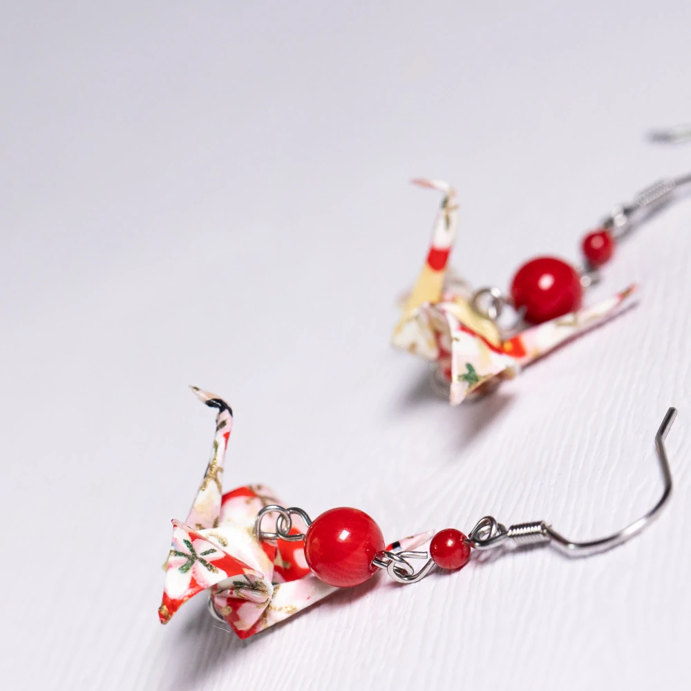 Náušnice vytvořené z washi papíru s ručním potiskem dovezeného přímo z Japonska. Papír je jemný, červený se vzorem květů sakur v barvách červené a bílé. Složila jsem z něj tradičního jeřába pro štěstí a doplnila dvěma korály.
