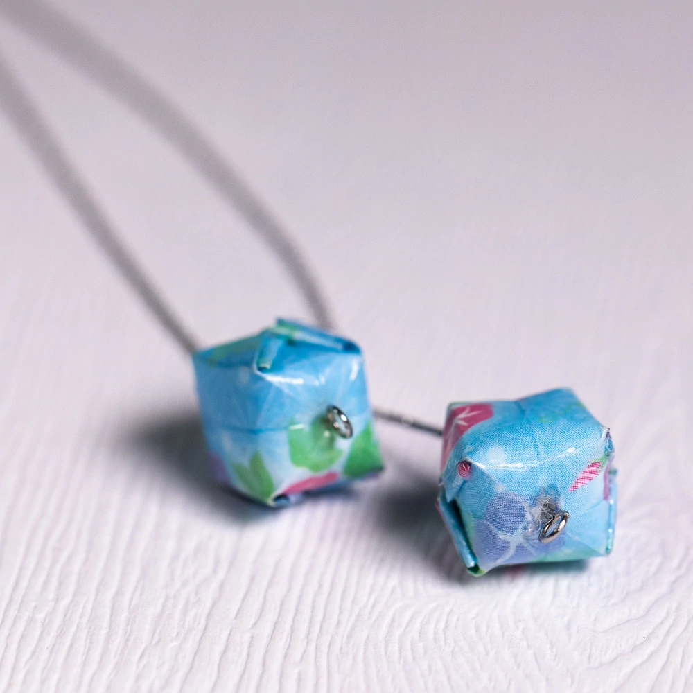 Náušnice jsou vytvořeny ze světle modrého origami papíru s potiskem květů svlačce. Složila jsem z něj vodní bombu a tu vyplnila dutým vláknem a navlékla na řetízek z chirurgické oceli. Řetízek se přímo provléká uchem a volně pak visí dolů. Náušnice dodávám s umělohmotnou zarážkou, abyste je nemohly ztratit.