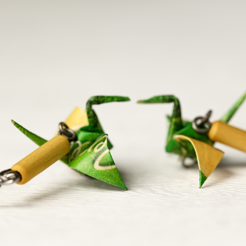 Náušnice vytvořené z čajových sáčků od čaje Peppermint with Lemon firmy Teekanne. Složila jsem z něj tvar tradičního jeřába a doplnila dřevěnými korálky.