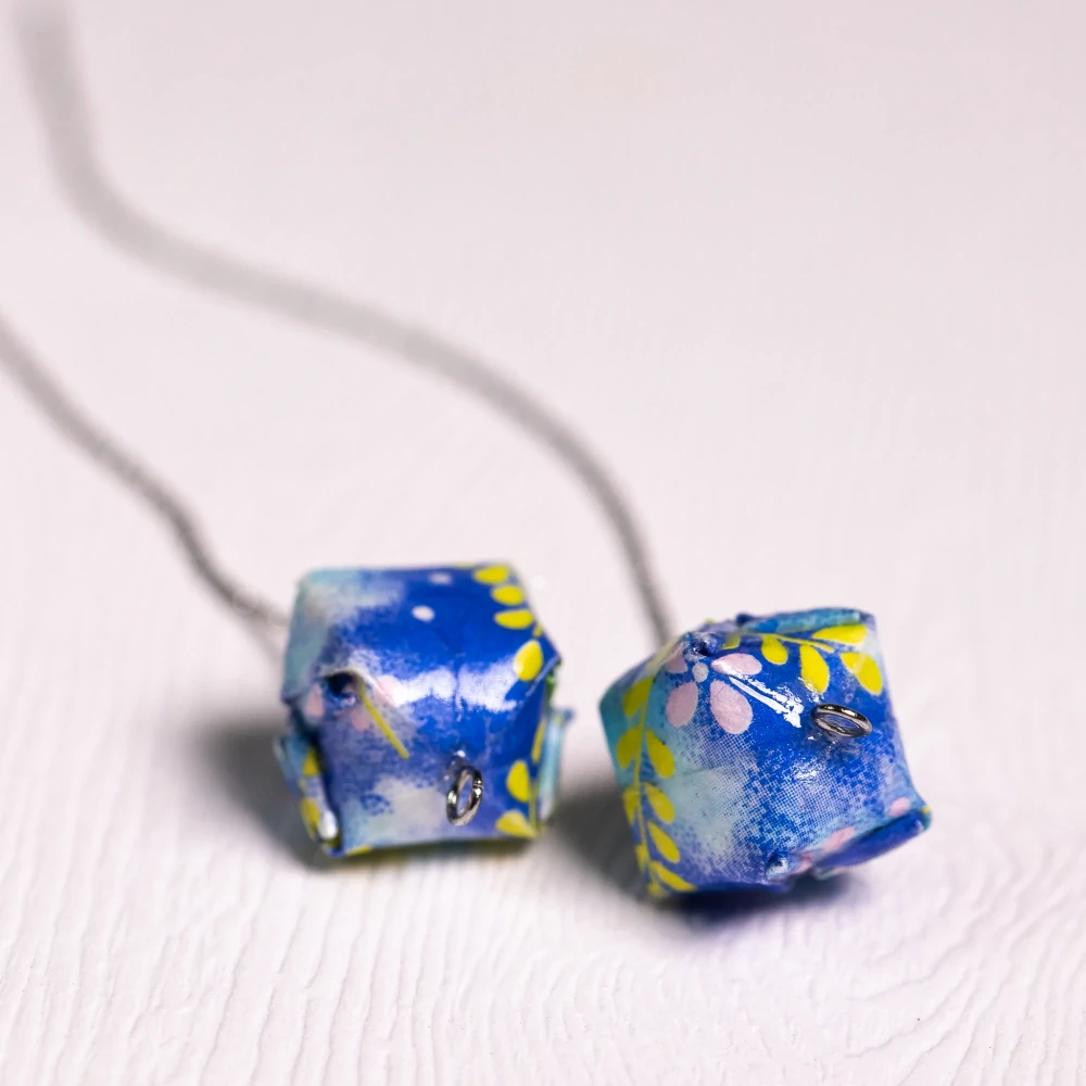 Náušnice jsou vytvořeny z origami papíru s potiskem v odstínech modré s potiskem lístečků. Složila jsem z něj vodní bombu a tu vyplnila dutým vláknem a navlékla na řetízek z chirurgické oceli. Řetízek se přímo provléká uchem a volně pak visí dolů. Náušnice dodávám s umělohmotnou zarážkou, abyste je nemohly ztratit.