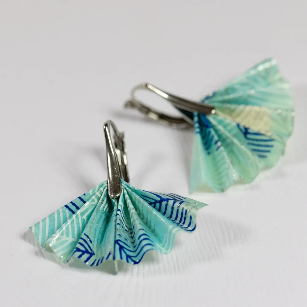 Origami náušnice vytvořené z kvalitního japonského washi papíru. Jsou upevněny na háček z chirurgické oceli vyrobený na zakázku.