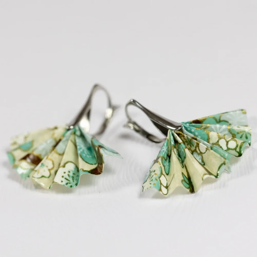 Origami náušnice vytvořené z kvalitního japonského washi papíru. Jsou upevněny na háček z chirurgické oceli vyrobený na zakázku.