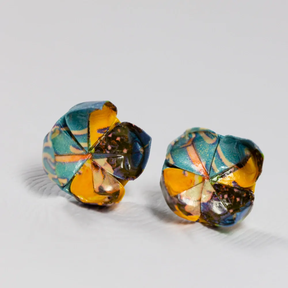 Jde o náušnice vytvořené origami technikou do tvaru lotosového květu na puzetě z chirurgické oceli. Květiny jsou složeny z papíru z čajových sáčků v barvě modré a žluté (čaj Multivitamin od Teekanne). Lotos má rozměr cca 1,3 x 1,3 cm.
