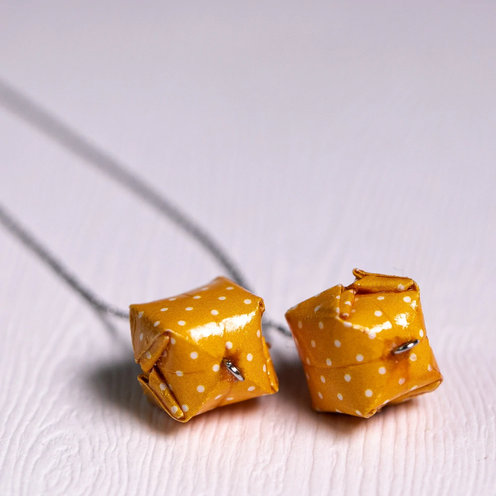 Náušnice jsou vytvořeny z oranžového origami papíru s potiskem drobných bílých puntíků. Složila jsem z něj vodní bombu a tu vyplnila dutým vláknem a navlékla na řetízek z chirurgické oceli. Řetízek se přímo provléká uchem a volně pak visí dolů. Náušnice dodávám s umělohmotnou zarážkou, abyste je nemohly ztratit.