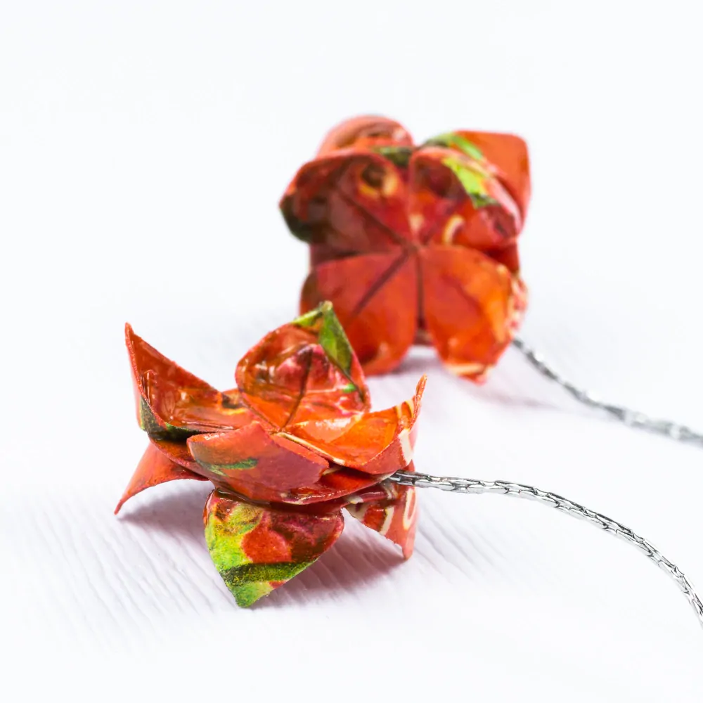 Jde o náušnice tvořené origami květy. Květiny jsou složeny z čajových sáčků Teekanne Red Berries. Květy jsou místo náušnicového háčku upevněny na řetízku z chirurgické oceli, takže by nemělo dojít k žádným alergickým reakcím. Zarážka proti ztrátě je z drobná plastová (v případě Vašeho zájmu mohu dodat i klasickou kovovou - "motýlka").