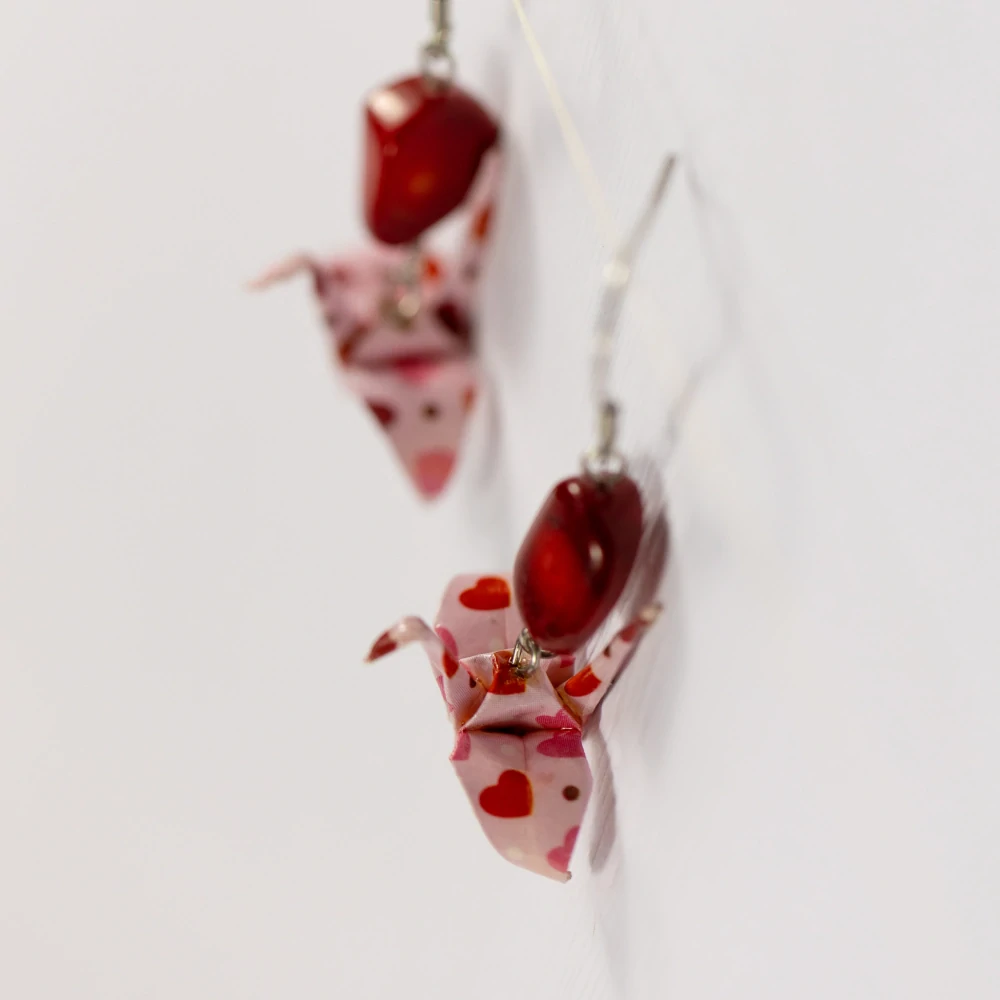 Náušnice vytvořené z origami papíru v růžové barvě s potiskem srdíček. Složila jsem z něj tvar tradičního jeřába a doplnila červeným korálem.