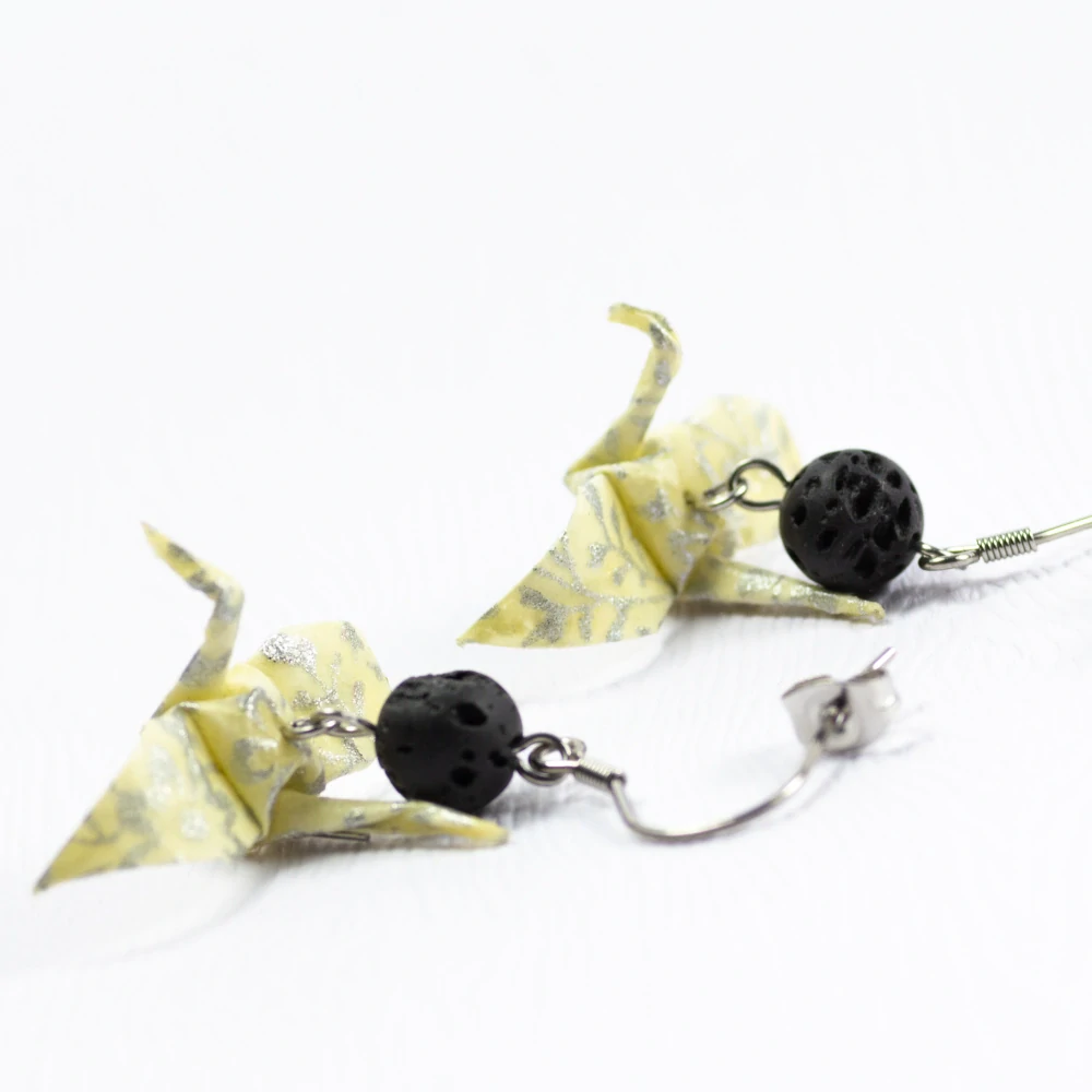 Náušnice vytvořené z washi papíru dovezeného z Japonska. Papír je jemný, se stříbrným jemným tiskem na bílém podkladu. Složila jsem z něj tradičního jeřába pro štěstí a doplnila kuličkou z lávového kamene.