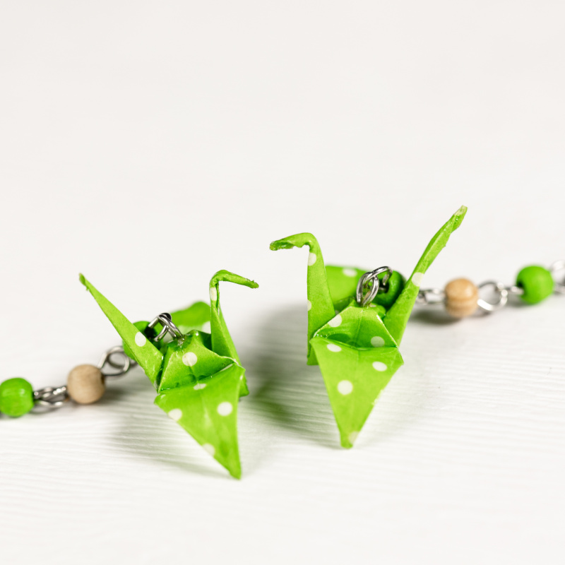 Náušnice vytvořené z washi papíru ve světle zelené barvě s bílými puntíky. Složila jsem z něj tradičního jeřába pro štěstí a doplnila dřevěnými korálky v odpovídajících barvách.