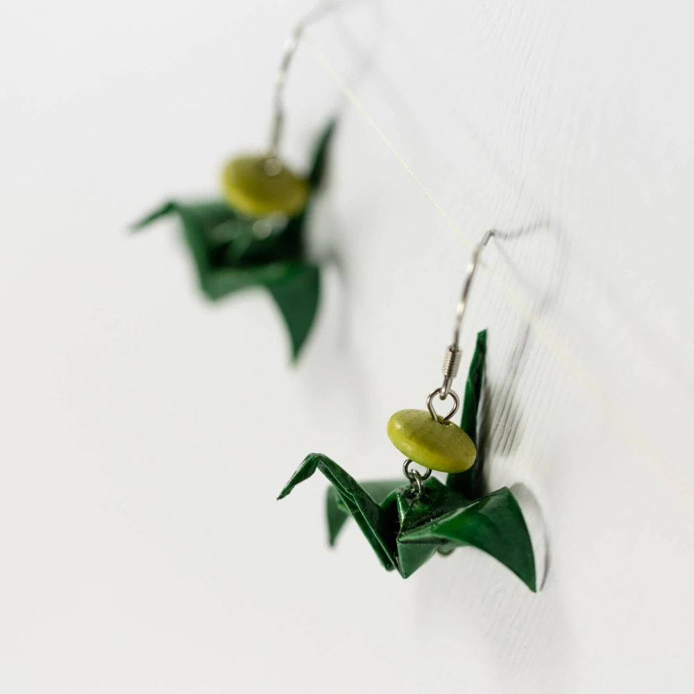 Náušnice vytvořené z origami papíru ve tmavě zelené barvě. Složila jsem z něj tvar tradičního jeřába a doplnila dřevěným korálkem ve tvaru disku.