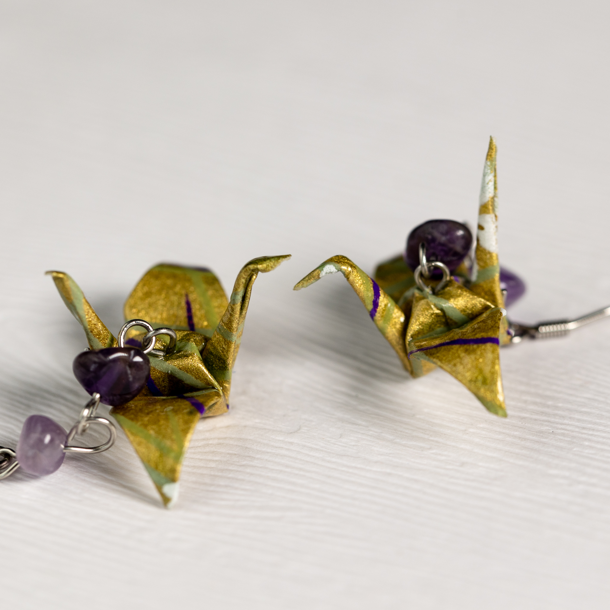 Náušnice vytvořené z washi papíru dovezeného z Japonska. Papír je zlatý s drobnými detaily ve fialové a bílé. Složila jsem z něj tradičního jeřába pro štěstí a doplnila zlomky ametystu.